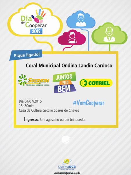 Compreendendo este espírito comunitário, a Cotriel e o Sicredi, juntamente com o Coral Municipal Ondina Landin Cardoso realizarão o Dia C de Cooperar 2015. Com o lema Juntos pelo Bem, o evento que acontecerá dia 04 de julho, sábado, no Centro Cultural Getúlio Soares de Chaves, será uma mateada cultural. O Coral Municipal Ondina Landin Cardoso fará uma apresentação com objetivo de arrecadar agasalhos e brinquedos. O início está previsto para as 15h30mim.