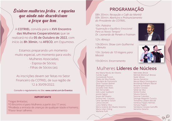* As inscrições serão realizadas no setor financeiro da COTRIEL e de sua região, e serão limitadas por nº de matricula (mulheres associadas) e grau de parentesco (esposa de sócio e filha de sócio, maior de 17 anos).