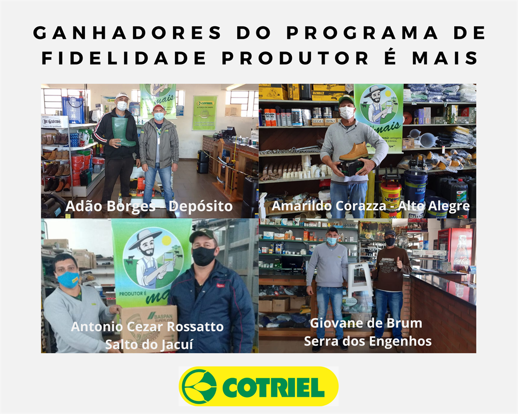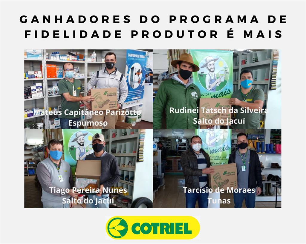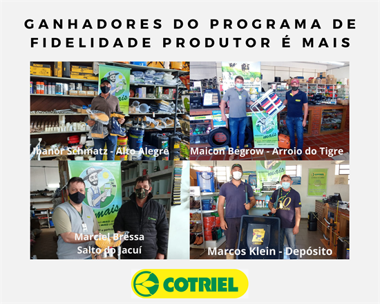 Os associados que receberam os prêmios a partir da quantidade de pontos acumulados no Programa de Fidelidade foram: Antonio Rossatto, Marciel Bressa, Rudinei Tatsch da Silveira e Tiago da Rosa Pereira Nunes, de Salto do Jacuí, de Espumoso: Mateus Capitânio Parizotto, de Alto Alegre: Amarildo Corazza e Ibanor Schmatz, Depósito: Adão Borges e Marcos Klein, Serra dos Engenhos: Giovane de Brum, Arroio do Tigre: Maicon Begrow e Tunas: Tarcísio Moraes. Foram um total de 12 associados premiados.