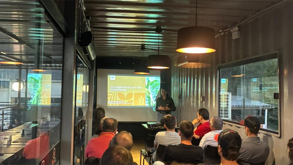 Eliana Geremia, profissional de Desenvolvimento de Mercado da Mosaic, conduziu a apresentação abordando a solubilidade do fósforo, as perspectivas do mercado de fertilizantes para o próximo ano e o fechamento de fórmulas, além de detalhar os diferenciais dos produtos da empresa, como os fertilizantes fosfatados de alta solubilidade e soluções que combinam nitrogênio, fósforo e enxofre em duas fontes em um único grânulo. E o Aspire que combina potássio e duas fontes de Boro. Também participaram Taís Cardoso, gerente de contas, e Guilherme Scariot, assistente técnico, reforçando o suporte da Mosaic no campo.