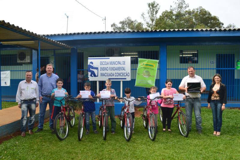 Projeto da empresa DuPont em parceria com a Cooperativa entregou bicicletas para alunos e notebook à escola Imaculada Conceição da localidade do Depósito.